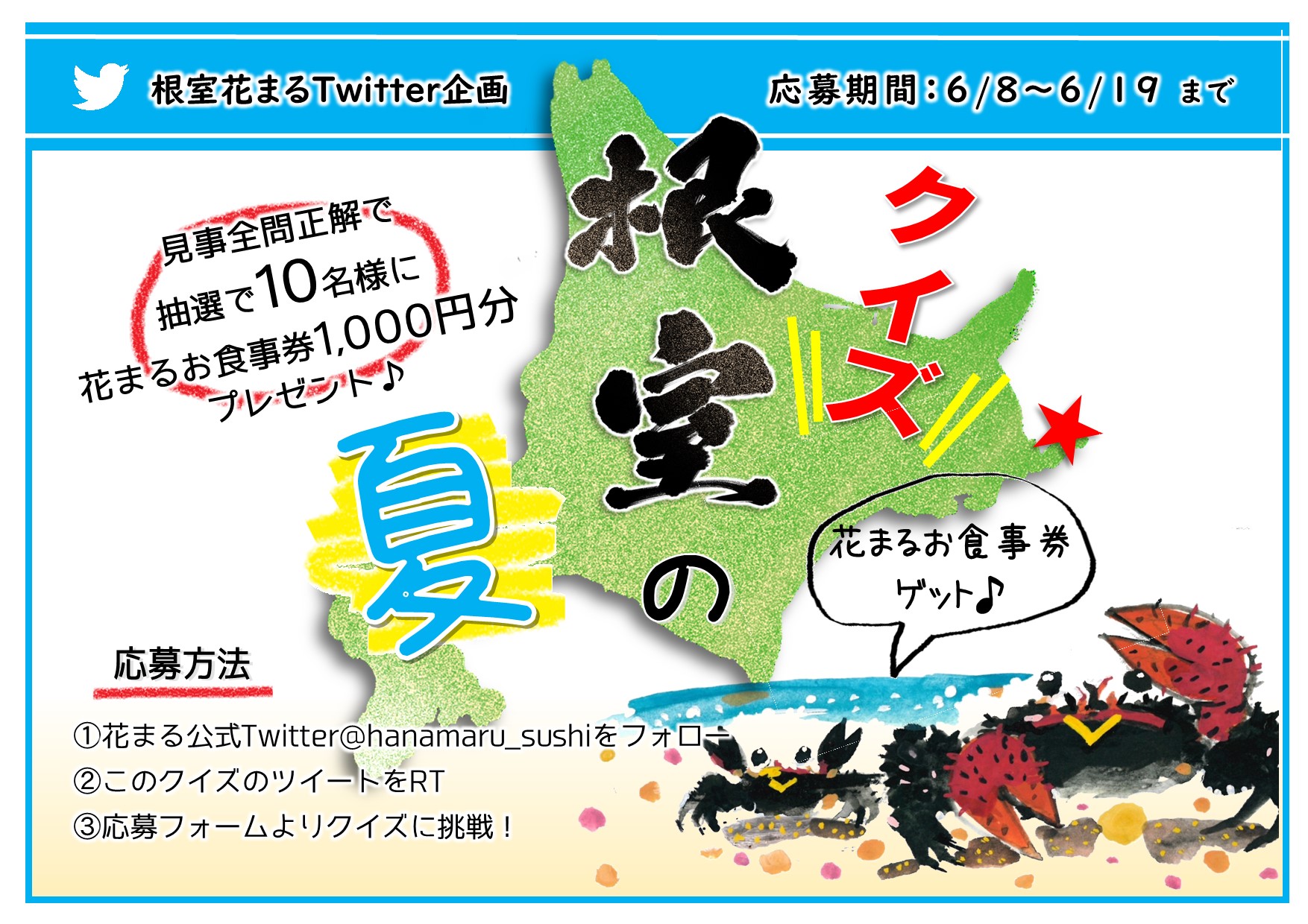 今回は、復港応援Twitter企画として「花まるお食事券」が当たる、根室花まる『クイズ根室の夏』を開催します!